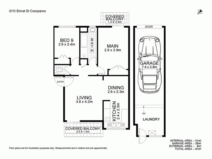 Boasting a total floor area of 87 square metres, including balconies and garage, the unit has a separate dining and living area with balcony, and a large master bedroom with balcony offering views to the South West. Both bedrooms have built in wardrobes. The bathroom has shower and bath tub and the toilet is separate.