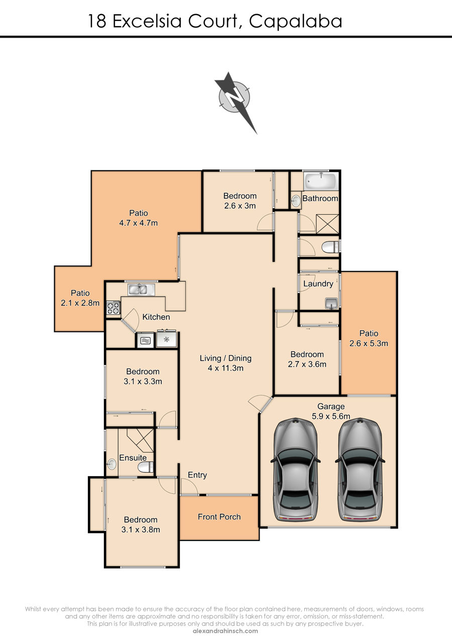 - Garage has drive through access to 2.6m x 5.3m covered patio for a third small vehicle/ trailer/ bikes/ jet skis etc