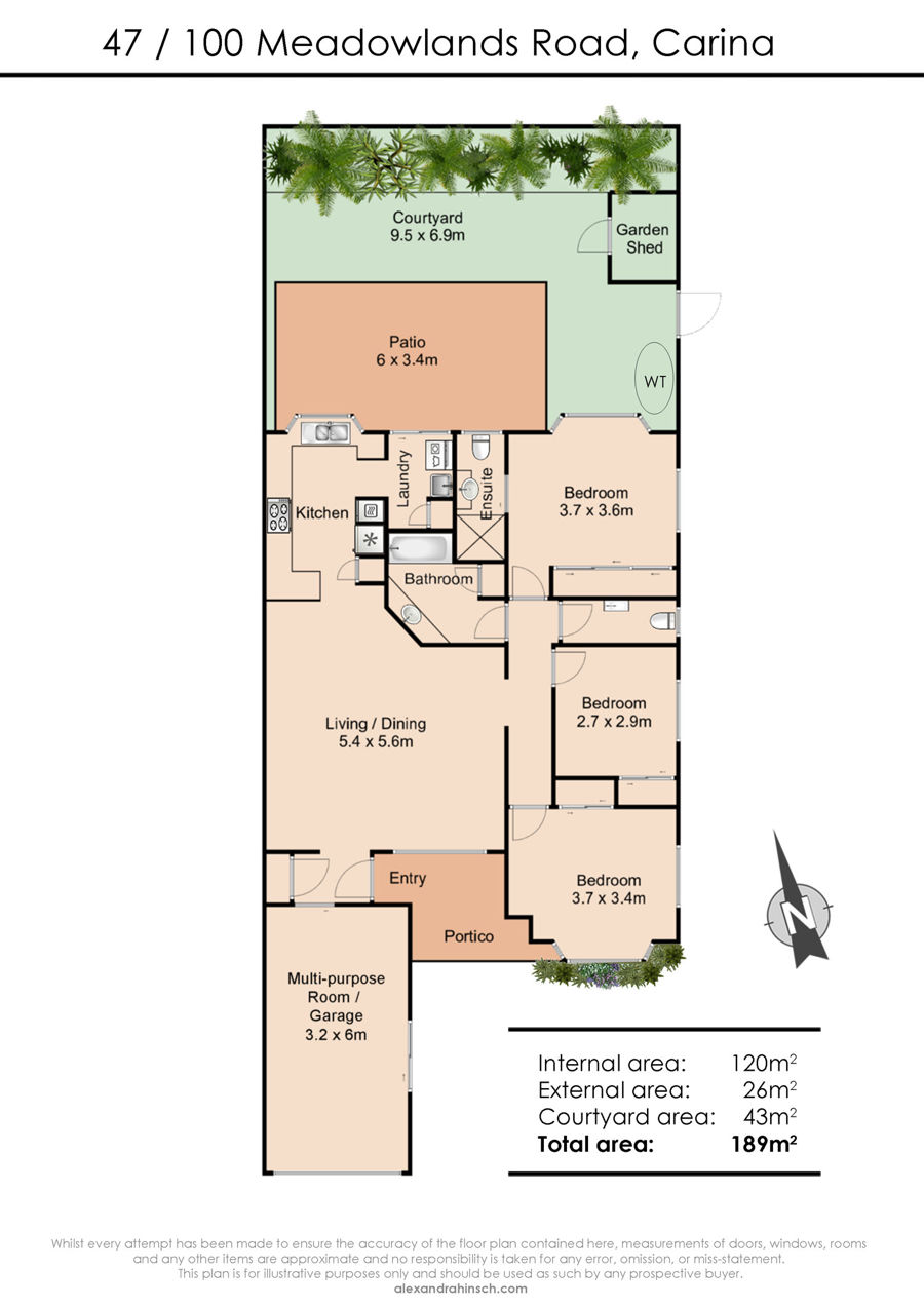 Positioned in a quiet pocket at the far end of one of Carina's most sought after resort style complexes. This villa offers security, peace of mind and convenience. Well maintained, this home presents practical, easy living across its single level design, offering 3 spacious bedrooms, generous kitchen, and a private, leafy, North facing courtyard. A unique opportunity to extend the clever floor plan is presented with a cost effective conversion of the garage to an additional expansive living area or bedroom with its existing separate sliding door entry and tiled floor.