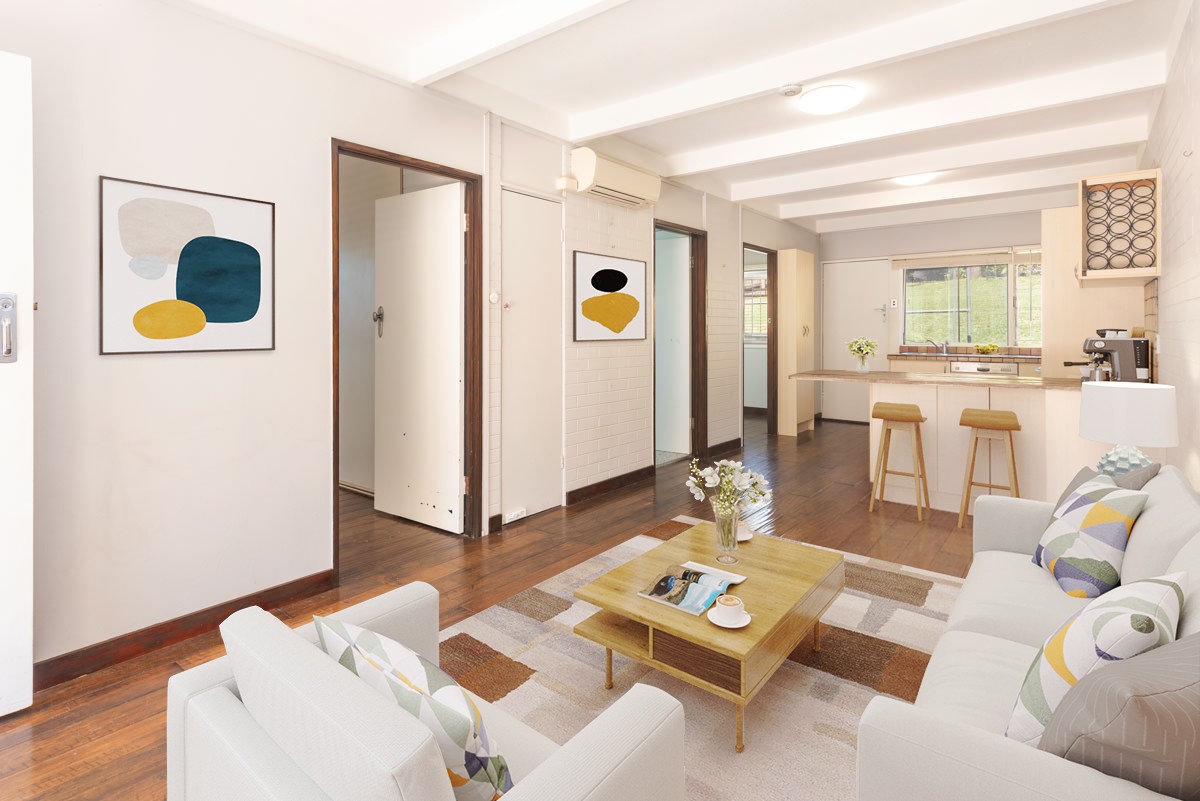 Brimming with character, this villa exudes charm and offers endless potential to enhance and make your own. Light-filled and airy, the home is framed by large windows and floor-to-ceiling louvres that invite breezes and natural light into every corner. Wide timber-look flooring set the tone for its funky, character-rich vibe, adding warmth and a touch of vintage flair.