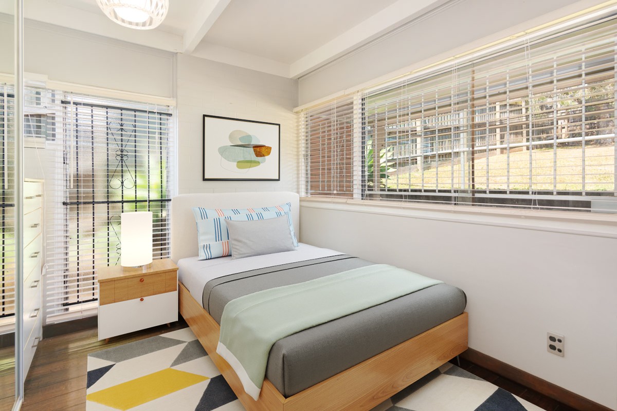 - Light filled and airy with large windows and floor to ceiling louvres