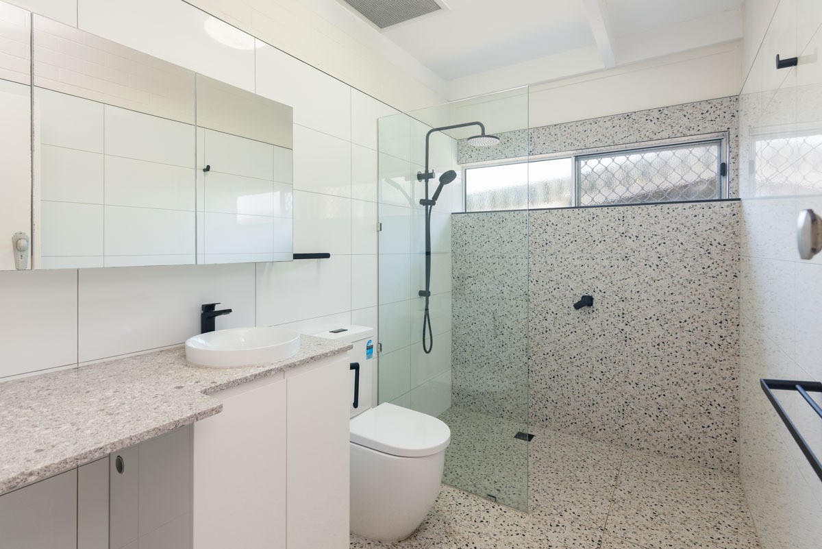 - Renovated bathroom with rainforest shower, combined space for laundry